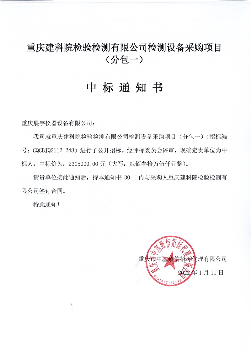重慶建科院檢驗(yàn)檢測有限公司委托重慶市中基致信招標(biāo)代理有限公司對(duì)我公司檢測設(shè)備采購項(xiàng)目(項(xiàng)目號(hào):CQCBJQ2112-248 )分包一(力學(xué))和分包二(化學(xué))進(jìn)行了公開招標(biāo)采購,現(xiàn)已完成全部采購程序。確認(rèn)重慶展宇儀器設(shè)備有限公司為分包一(力學(xué))中標(biāo)人,中標(biāo)價(jià)為2305000元(貳佰參拾萬伍仟佰元整)。確認(rèn)重慶典鼎科技有限公司為分包二(化學(xué))中標(biāo)人,中標(biāo)價(jià)為1828000元(壹佰捌拾貳萬捌仟元整)。