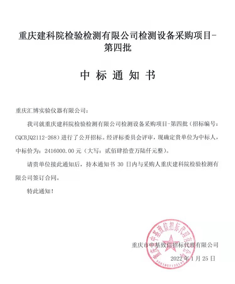 重慶建科院檢驗檢測有限公司委托重慶市中基致信招標代理有限公司對我公司檢測設備采購項目(項目號:CQCBJQ2112-268 )重慶建科院檢驗檢測有限公司檢測設備采購項目-第四批進行了公開招標采購,現(xiàn)已完成全部采購程序。確認重慶匯博實驗儀器設備有限公司為檢測設備采購項目-第四批中標人,中標價為2416000元(貳佰肆拾壹萬陸仟佰元整)。