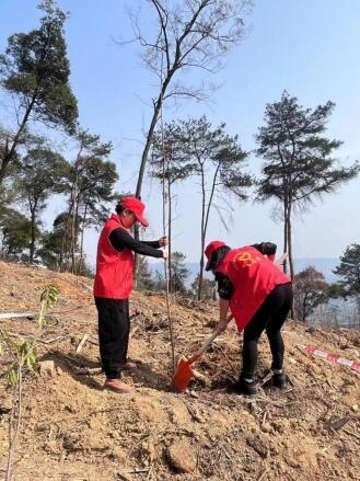 此次植樹點位于縉云山歇馬街道“8.21”山火發(fā)生地,2022年,重慶歷經(jīng)“8.21”山火考驗,需通過人工造林對受災(zāi)區(qū)域進行修復(fù)。半年后,春風(fēng)又綠縉云山,伴隨驕陽,第一黨支部全體黨員同志們身穿紅馬甲,頭戴“小紅帽”,到達植樹點后揮鍬挖土、扶正樹苗、填土夯苗、堆砌圍堰、澆水灌溉......接連種下一棵棵木荷樹、楓香樹?,F(xiàn)場一片繁忙景象,其樂融融、氣氛熱烈。