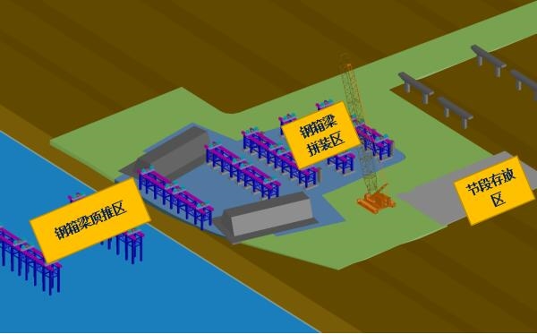 為避免河道水資源污染,確保航道通暢,箱梁采用整節(jié)段拼裝、頂推施工工藝。主橋鋼結構現(xiàn)場施工分為鋼箱梁頂推和拱肋吊裝兩部分,鋼箱梁塊段運輸至現(xiàn)場的拼裝支架上組拼成大塊段節(jié)段,焊接完成整體后進行頂推施工(鋼箱梁頂推施工期間, 18#、21#墩引橋側(cè)高蓋梁暫不施工,主橋側(cè)支座墊石正常施工),依次循環(huán),直至鋼箱梁全部頂推完成。拱肋放置于鋼箱梁對應位置一同頂推到位,鋼箱梁整體落梁至頂推臨時支架上,2臺400t履帶吊上橋進行拱肋支架安裝和拱肋安裝。過程中通過整體頂推設備控制程序自動調(diào)節(jié),確保設備的協(xié)調(diào)同步。