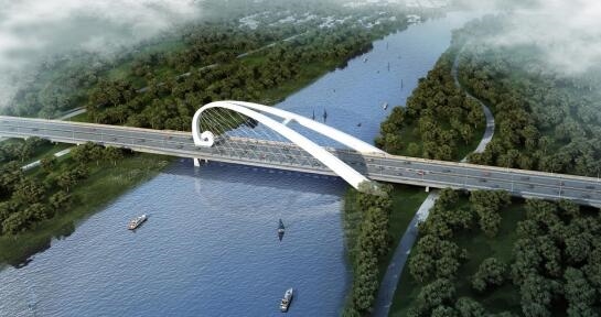 香河縣安石路(運河大道-冀京界段)建設工程是《北京市通州區(qū)與河北省三河、大廠、香河三縣市協(xié)同發(fā)展規(guī)劃》的重點工程,也是北運河廊坊段旅游通航的重要組成部分,路線全長3.624公里,采用一級公路兼城市主干路標準建設,道路標準橫斷面采用四幅路形式,雙向六條機動車道,外設非機動車道和人行道,路基寬47米。其中橋梁段(即王家擺大橋)長1060.1米(主橋長256米,引橋長804.1米),采用抱翅型拱梁組合體系,由“Λ”字抱翅外形的空間異形主拱拱圈、拱圈內(nèi)與主梁連接的斜吊桿和主梁三大主體結構組合而成,主梁半幅為整體鋼箱,半幅之間用橫梁連接,拉索錨固在抱翅拱和主梁的橫梁上,橋面板采用正交異性鋼橋面板。抱翅拱的一端在中央隔離帶處與主梁橫梁連接,下接中墩支座;抱翅拱的另一端成“Λ”形分布于主梁兩側(cè),通過橫梁與主梁連接。造型創(chuàng)意以如意型浪花為構思元素,將運河之水奔流涌動之態(tài)和如意的古典華美抽象融合,建成后將成為當?shù)匾蛔鶚O富美感的景觀橋。