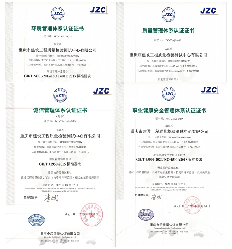 近日,經(jīng)過質(zhì)量、環(huán)境、職業(yè)健康安全、誠信管理體系現(xiàn)場評審,重慶設(shè)計集團市建科院公司所屬子公司——重慶市建設(shè)工程質(zhì)量檢驗測試中心有限公司(簡稱檢測中心)順利通過2023年度ISO資質(zhì)再認證評審。