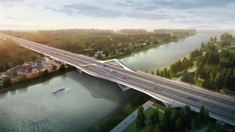主橋設(shè)計(jì)采用梁-拱型組合體系,立意“荷香”,將荷葉形態(tài)融入到橋梁造型當(dāng)中,荷葉浮于運(yùn)河之上,整個(gè)造型宛如運(yùn)河上盛開(kāi)的荷花,生態(tài)自然,與環(huán)境融為一體,給人以生機(jī)盎然、自然和諧的美感。