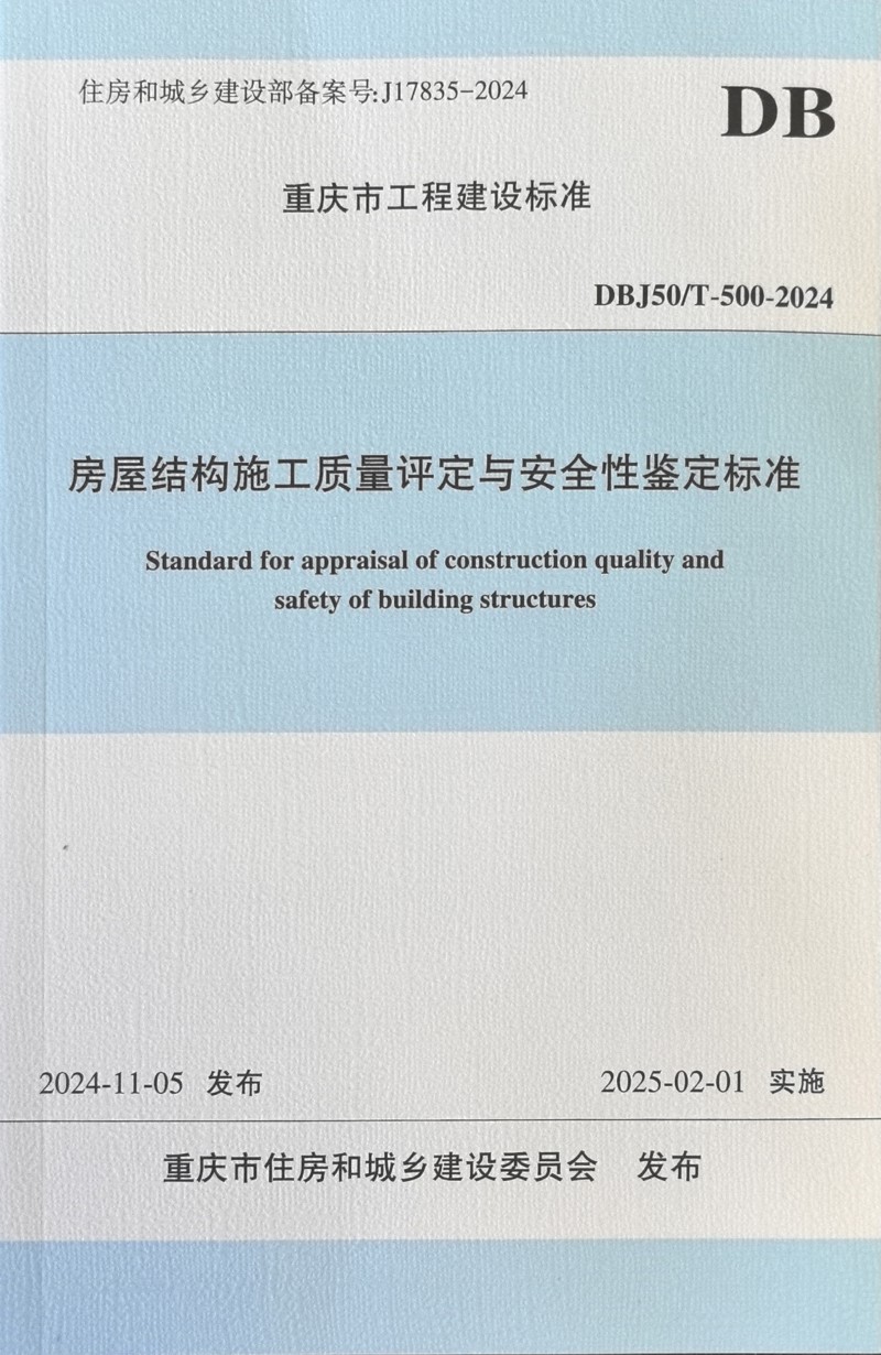 經(jīng)市住房城鄉(xiāng)建委批準(zhǔn),由市建科院主編的重慶地方標(biāo)準(zhǔn)《房屋結(jié)構(gòu)施工質(zhì)量評(píng)定與安全性鑒定標(biāo)準(zhǔn)》(DBJ50/T-500-2024)將于2025年2月1日起施行。