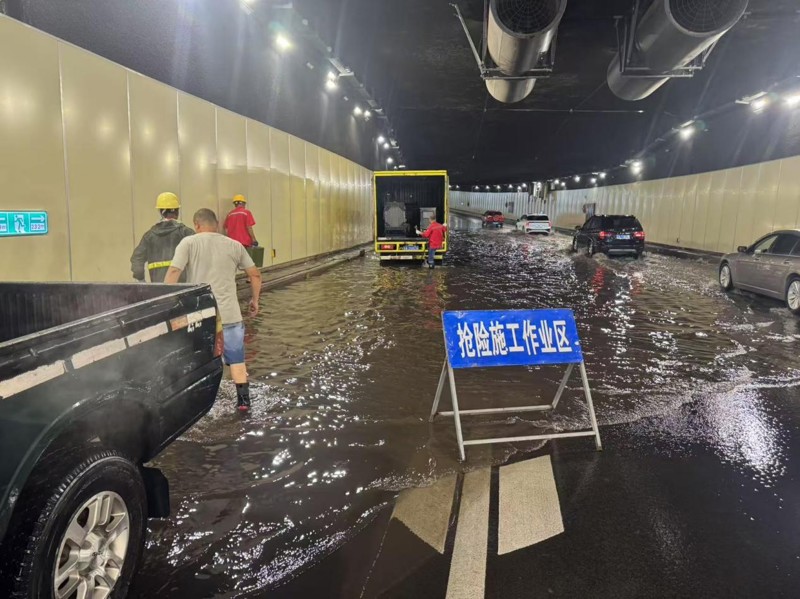 某區(qū)某隧道因地勢(shì)低洼且缺乏沉砂池,暴雨導(dǎo)致隧道中段嚴(yán)重積水,交通中斷。市建科院應(yīng)急隊(duì)伍火速趕赴現(xiàn)場(chǎng),會(huì)同市政管網(wǎng)管理及設(shè)施維護(hù)單位,徹夜奮戰(zhàn),采取緊急排水措施,全力保障隧道通行安全及結(jié)構(gòu)穩(wěn)定。