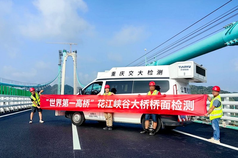在此次挑戰(zhàn)世界之巔的檢測(cè)任務(wù)中,市建科院所屬重慶交大建設(shè)工程質(zhì)量檢測(cè)中心有限公司檢測(cè)團(tuán)隊(duì)將“檢測(cè)公正、服務(wù)及時(shí)、方法科學(xué)、誠實(shí)守信、遵規(guī)守紀(jì)”的質(zhì)量方針貫穿于項(xiàng)目全生命周期,為大橋橋面檢測(cè)任務(wù)量身定制了科學(xué)周密、前瞻精準(zhǔn)的技術(shù)方案。在項(xiàng)目實(shí)施過程中,檢測(cè)團(tuán)隊(duì)?wèi){借深厚的技術(shù)實(shí)力攻克了因橋面超高、跨度極大帶來的系列“高精尖”檢測(cè)難題。他們對(duì)每一次檢測(cè)質(zhì)量嚴(yán)格把關(guān),讓檢測(cè)數(shù)據(jù)精準(zhǔn)、及時(shí)、科學(xué)地呈現(xiàn)在檢測(cè)報(bào)告上,確保了所有檢測(cè)指標(biāo)均符合大橋設(shè)定與行業(yè)規(guī)范。