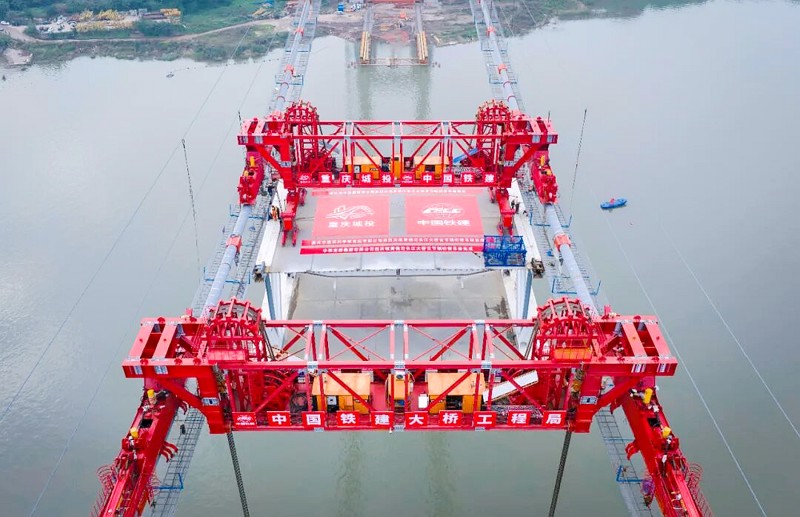 此次吊裝的鋼桁梁寬36.5米、長22.5米、高14米,吊重達(dá)695噸,相當(dāng)于350輛轎車的總重量,是目前長江上游地區(qū)所建橋梁中單節(jié)段重量最大的鋼桁梁,也是黃桷沱大橋全橋最重節(jié)段。其吊裝作業(yè)風(fēng)險(xiǎn)高、技術(shù)難度巨大,施工采用了“工廠預(yù)制鋼桁梁節(jié)段+現(xiàn)場(chǎng)吊裝拼接”的方式,即在工廠標(biāo)準(zhǔn)化生產(chǎn)精度高、質(zhì)量可控的鋼桁梁,運(yùn)至現(xiàn)場(chǎng)后利用纜載吊機(jī)直取吊裝。