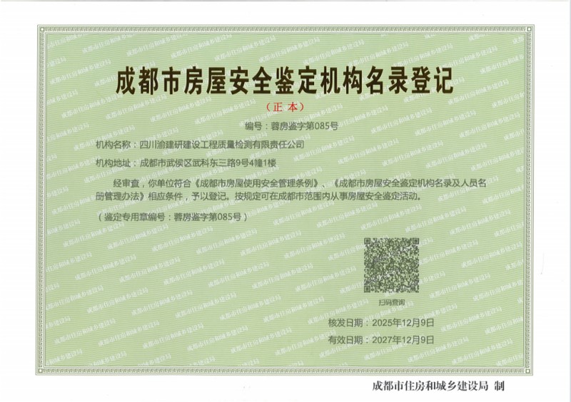 此次鑒定機(jī)構(gòu)資格審查的通過,標(biāo)志著四川渝建研公司在房屋安全鑒定領(lǐng)域的技術(shù)實(shí)力得到了成都市主管部門的肯定,公司也正式獲得參與成都市各類房屋安全鑒定項(xiàng)目的資質(zhì)許可,可面向客戶提供專業(yè)、高效的鑒定服務(wù)。